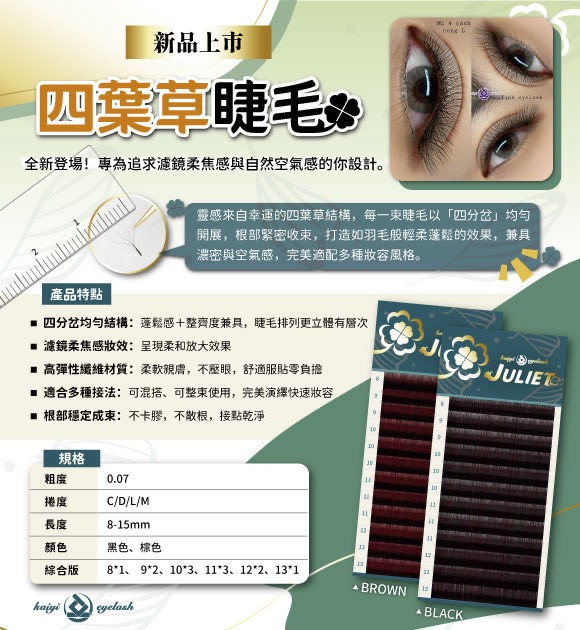 靈感來自幸運的四葉草結構,每一束睫毛以「四分叉」均勻開展,根部緊密收束,打造如羽毛般輕柔蓬鬆的效果,兼具濃密與空氣感,完美適配多種妝容風格。